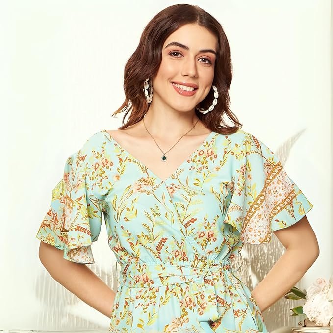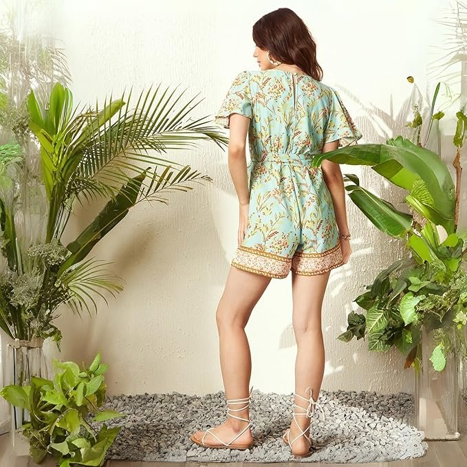 Berrylush Women Floral Printed V-Neck Waist Tie-Up Wrap Mini Playsuit